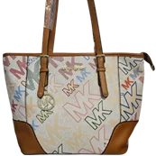- Design: Multicolor “MK” monogram print on canvas with tan leather trim.